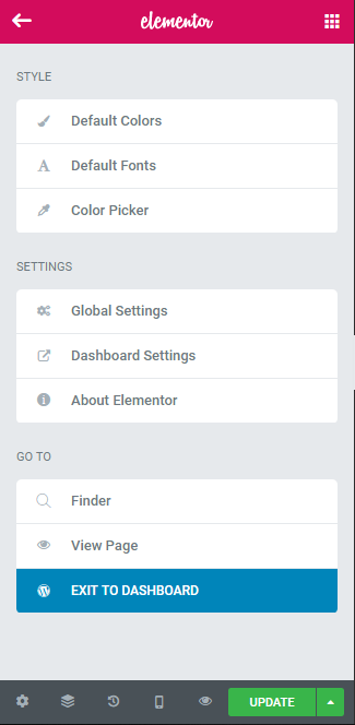 Bagian ini memuat pengaturan basic Elementor. Terdiri dari tiga opsi yang berbeda, yaitu Style, Settings, dan Go To.