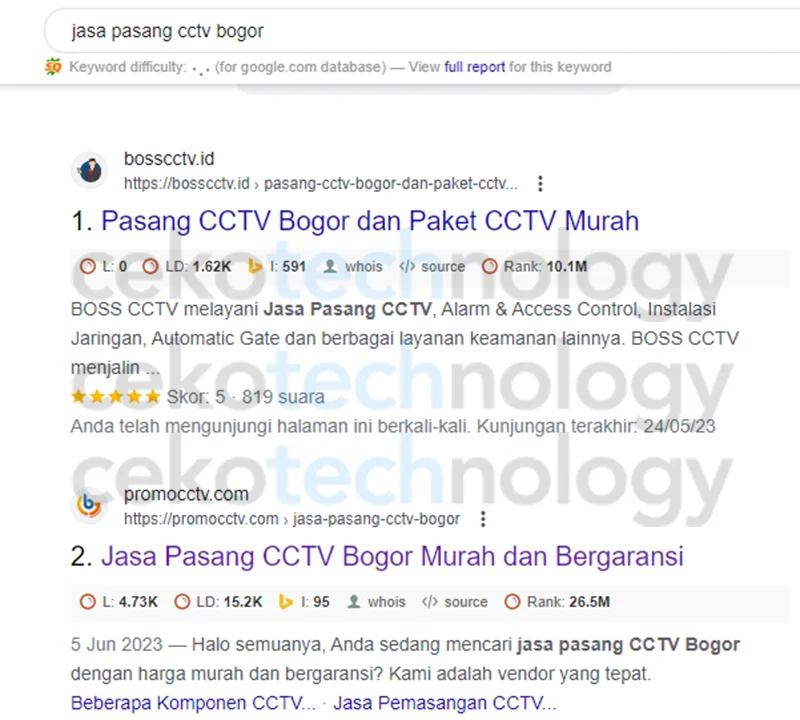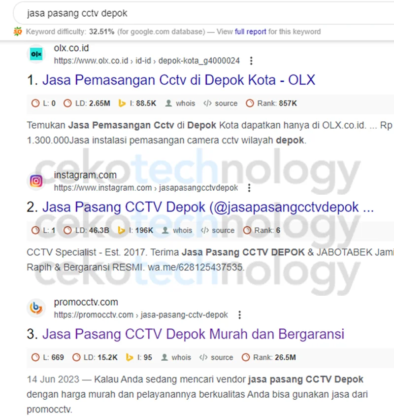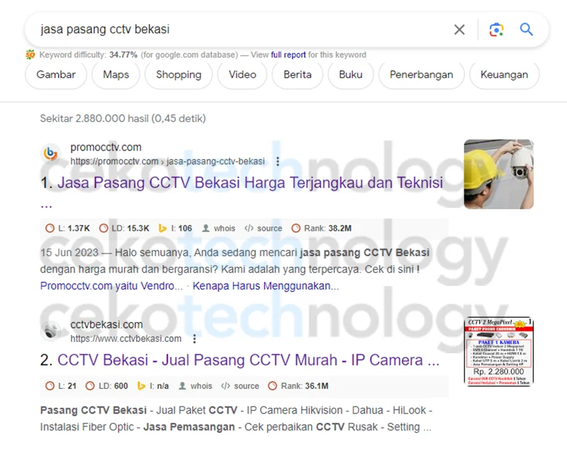 Jangan percaya jika tidak melihat hasil kerja dari kami. Berikut adalah beberapa website yang sudah kami optimasi dan hasilnya memuaskan. Salah satunya yaitu Website Jasa Pasang CCTV (promocctv.com).