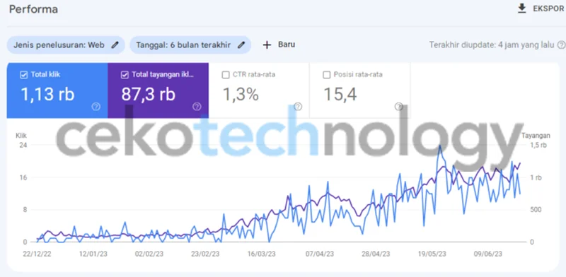 Bisa Anda lihat dalam 6 bulan terakhir, perkembangan trafik organik dari website tersebut naik secara signifikan. Dan inilah keyword-keyword yang sudah menempati peringkat tinggi di mesin pencari Google.